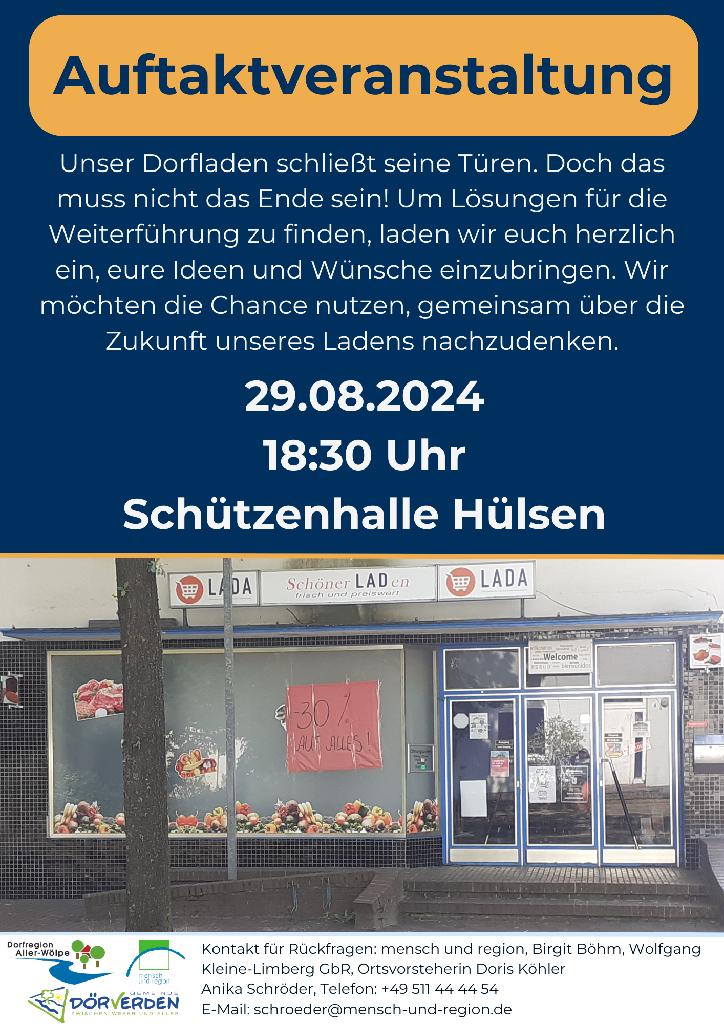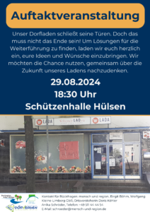 Unser Dorfladen schließt seine Türen. Doch das muss nicht das Ende sein! Um Lösungen für die Weiterführung zu finden, laden wir euch herzlich ein, eure Ideen und Wünsche einzubringen. Wir möchten die Chance nutzen, gemeinsam über die Zukunft unseres Ladens nachzudenken.